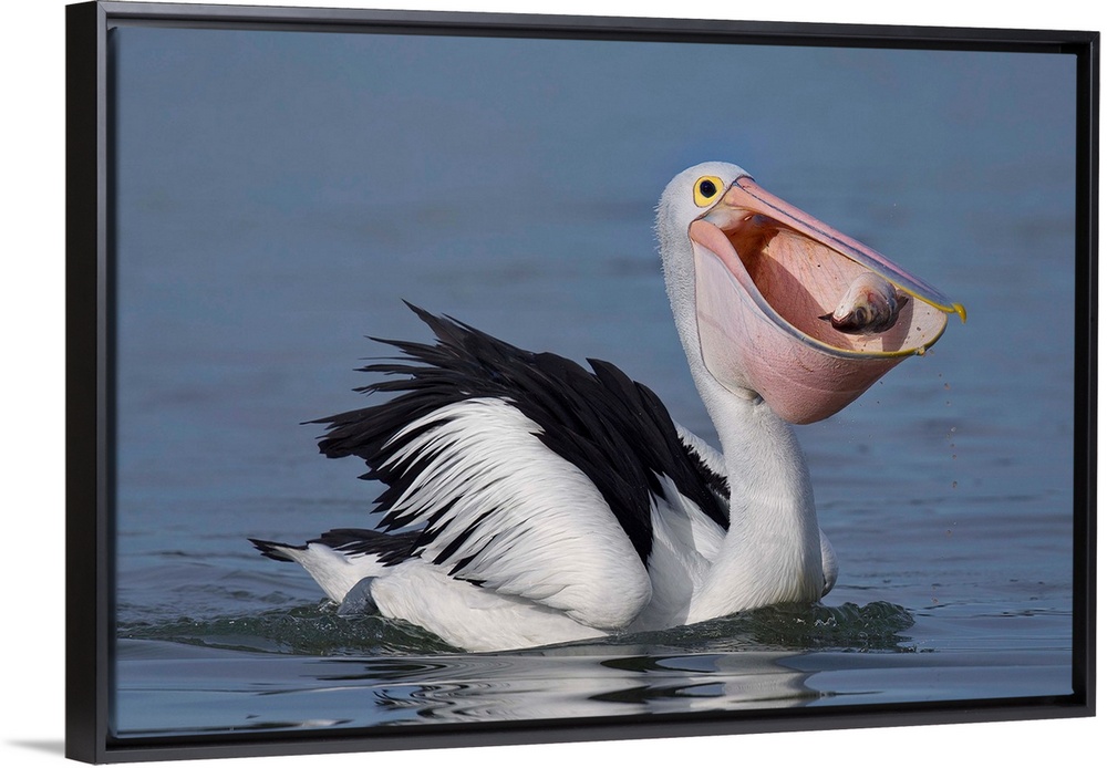 <p>A pelican caught i the act of catching a fish in its mouth.</p>