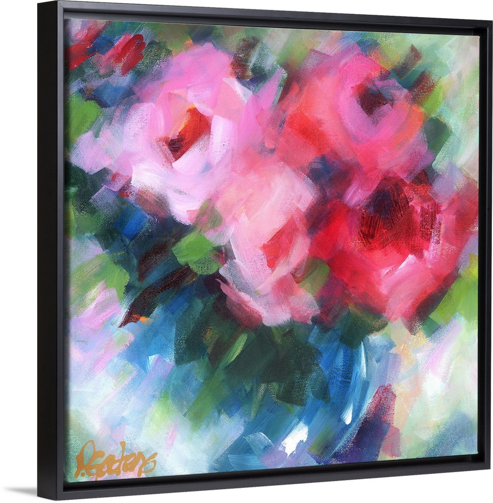 <p>A square abstract painting of bright pink flowers.</p>