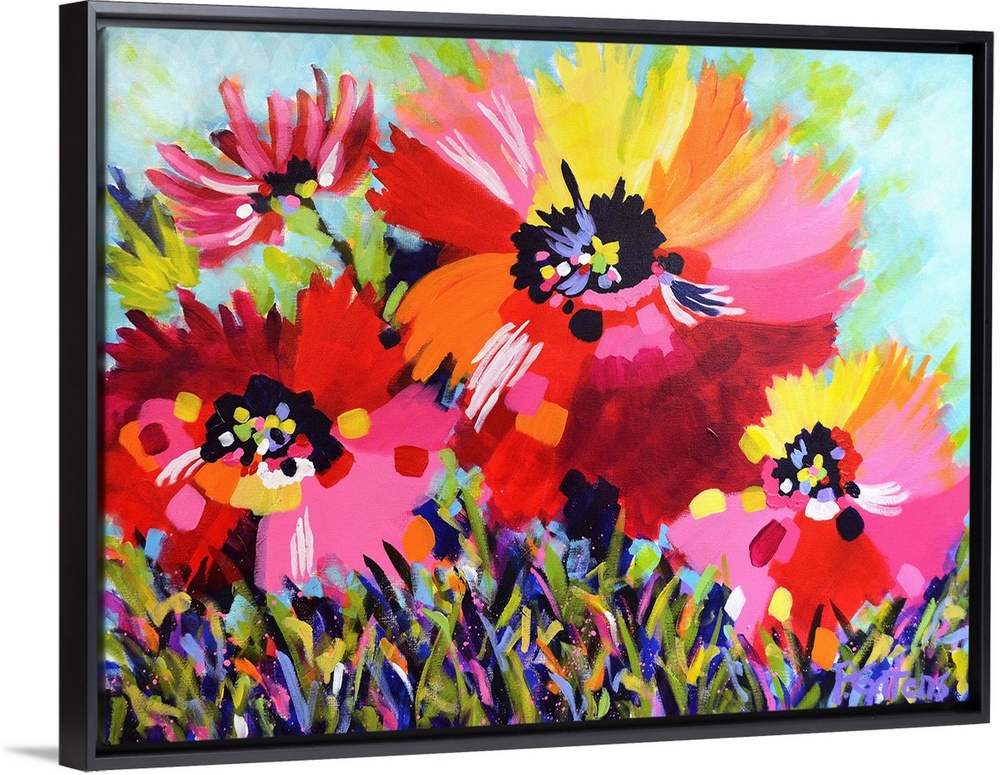 <p>A horizontal abstract painting of bright poppies in colors of yellow, red and pink.</p>