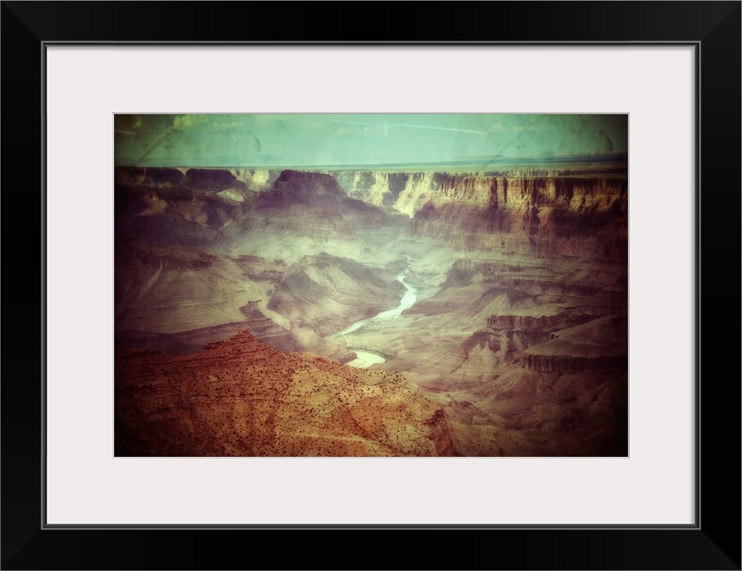 <p>Big rocks in the foreground, huge canyon and Colorado river in the background land looking across the Grand Canyon in USA in fisheye mode in a blue summer sky with texture layer</p>