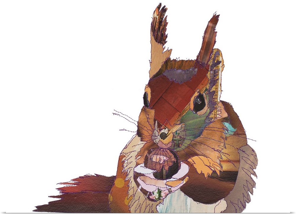 <p>Horizontal artwork of a red squirrel with a nut in a collage style outlined in stitches.</p>