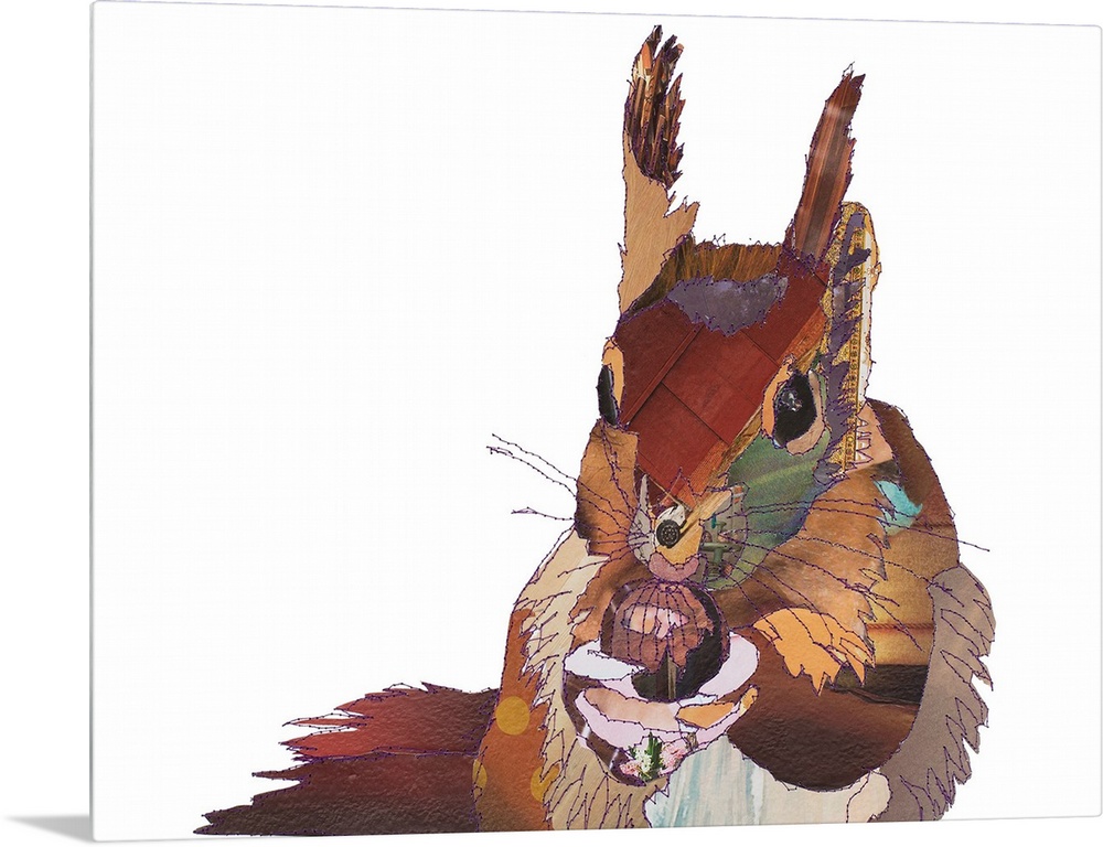 <p>Horizontal artwork of a red squirrel with a nut in a collage style outlined in stitches.</p>