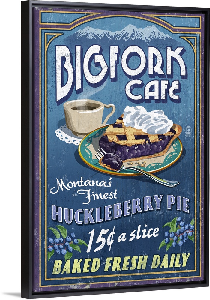 <p>Retro stylized art poster advertising a latice crust pie and a cup of coffee along with typography describing a ficticious cafo and the berries that made the pie.</p>