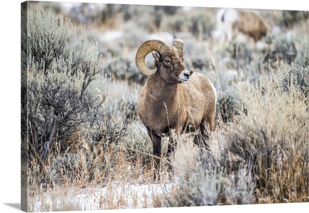 <p>Bighorn Sheep ram (Ovis canadensis) stands in a sagebrush meadow in the North Fork of the Shoshone River valley near Yellowstone National Park; Wyoming, United States of America.</p>