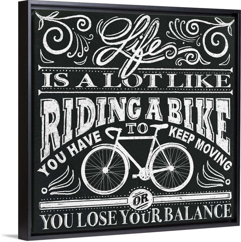 <p>Typography artwork in a chalkboard style reading "Life is a lot like riding a bike, you have to keep moving or you lose your balance."</p>