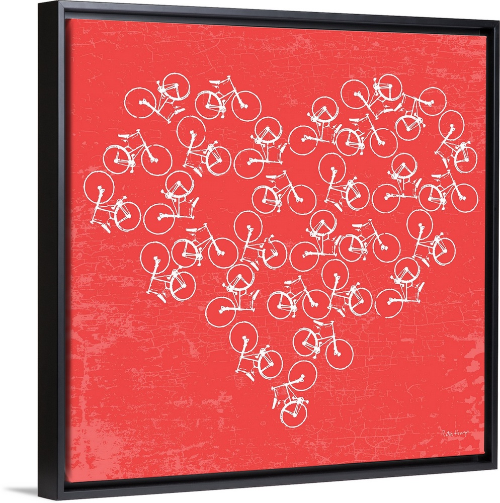 <p>Many illustrated white bikes arranged in the shape of a heart on a red background.</p>