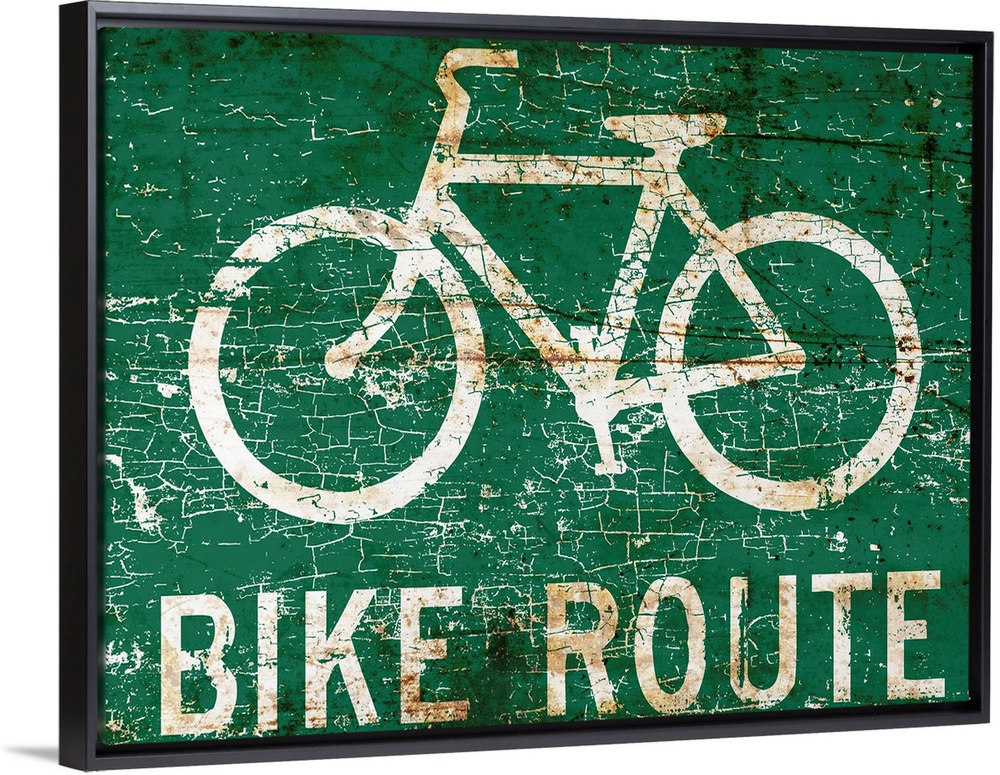 <p>A worn, distressed, cracked and rusty bike route street sign.</p>