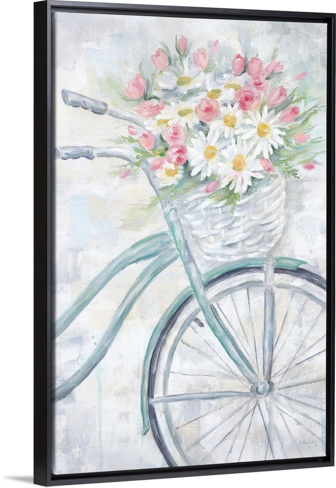 <p>Contemporary painting of a teal bicycle with a basket full of spring flowers on a gray background.</p>
