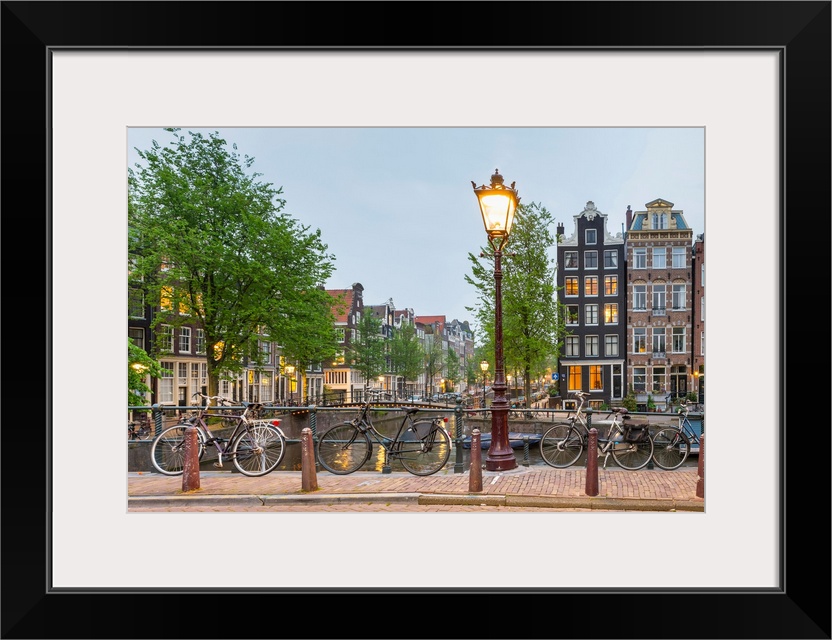 <p>Bikes and houses along canal at dusk at intersection of Herengracht and Brouwersgracht, Amsterdam, North Holland, Netherlands</p>