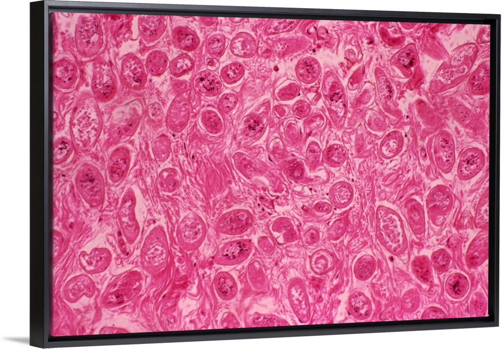 <p>Bilharzia infection. Light micrograph of human ureter tissue that contains numerous eggs from Schistosoma flukes. The ureters are tubes that carry urine from the kidneys to the bladder. The Schistosoma sp. flukes (small parasitic worms) cause the tropical disease bilharzia (schistosomiasis). Eggs are expelled into lakes and rivers in urine from infected humans. The eggs hatch into larvae, infect aquatic snails, and develop into cercariae. After leaving the snail, the cercariae infect humans who enter the water. The mature adult form lives in bladder veins, where the females lay many hundreds of eggs that accumulate in body tissues and cause damage.</p>