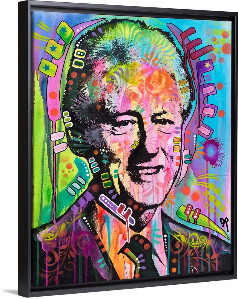 <p>Pop art style painting of Bill Clinton in different colors and covered in abstract designs.</p>