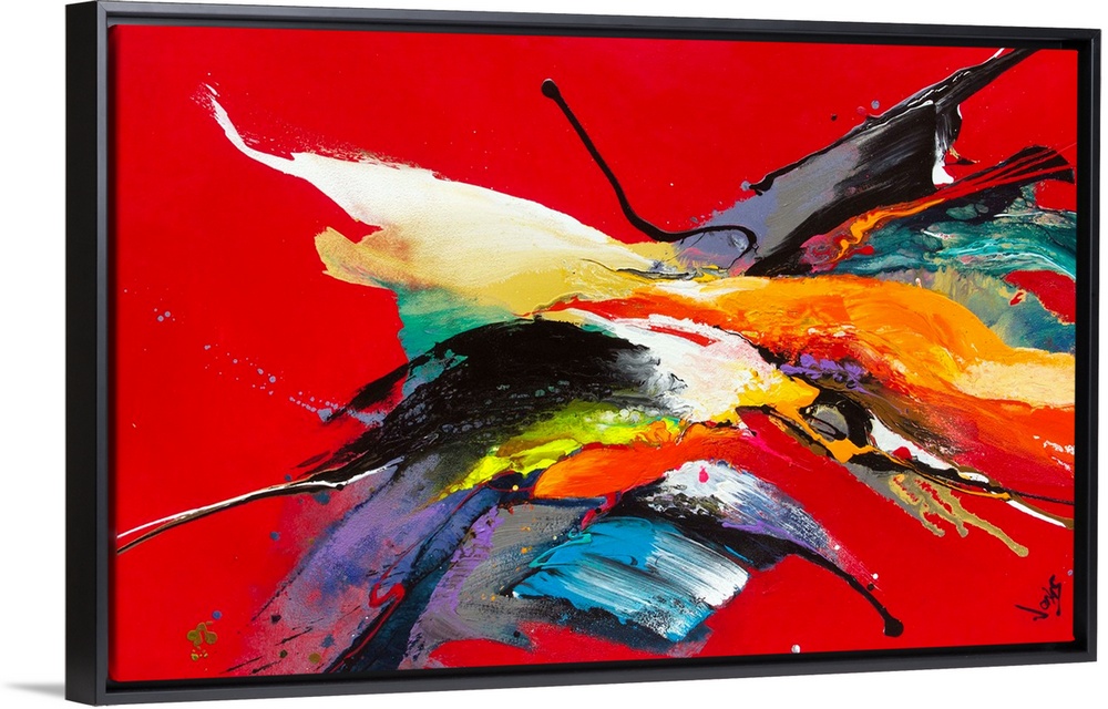 <p>Contemporary abstract painting using splashes of wild and vivid colors against a stark red background.</p>