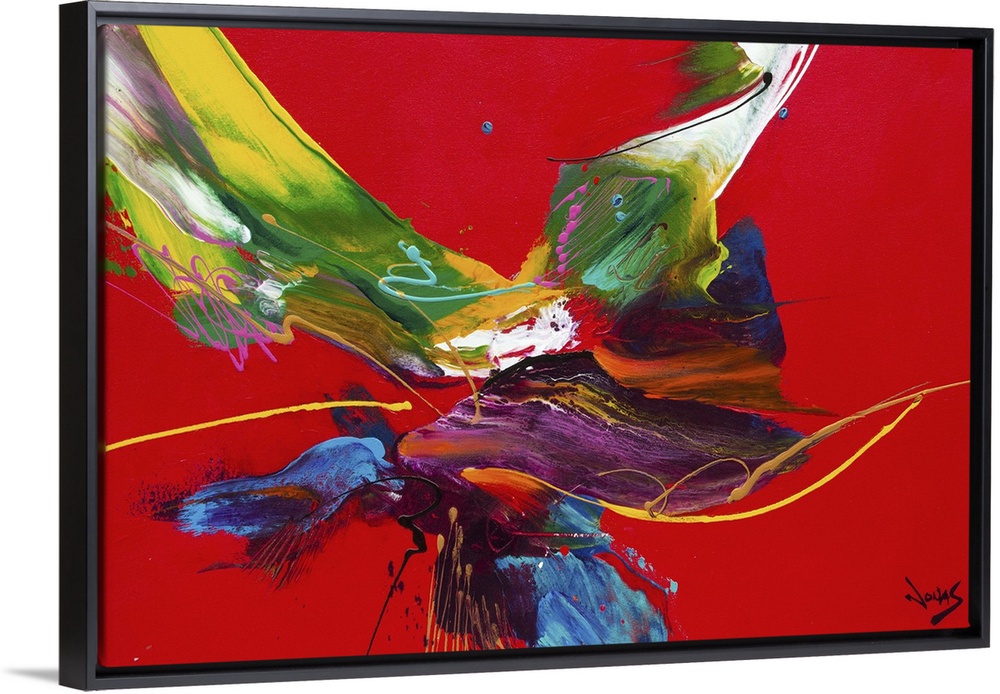 <p>Contemporary abstract painting using splashes of wild and vivid colors against a stark red background.</p>