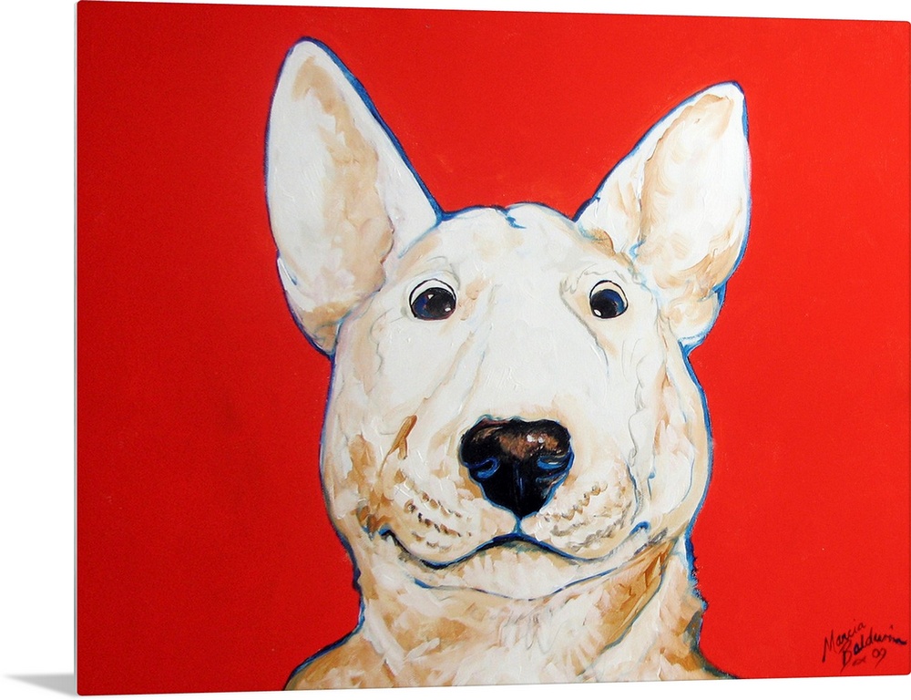<p>Painting of a white bull terrier with a blue outline on a bright red background.</p>