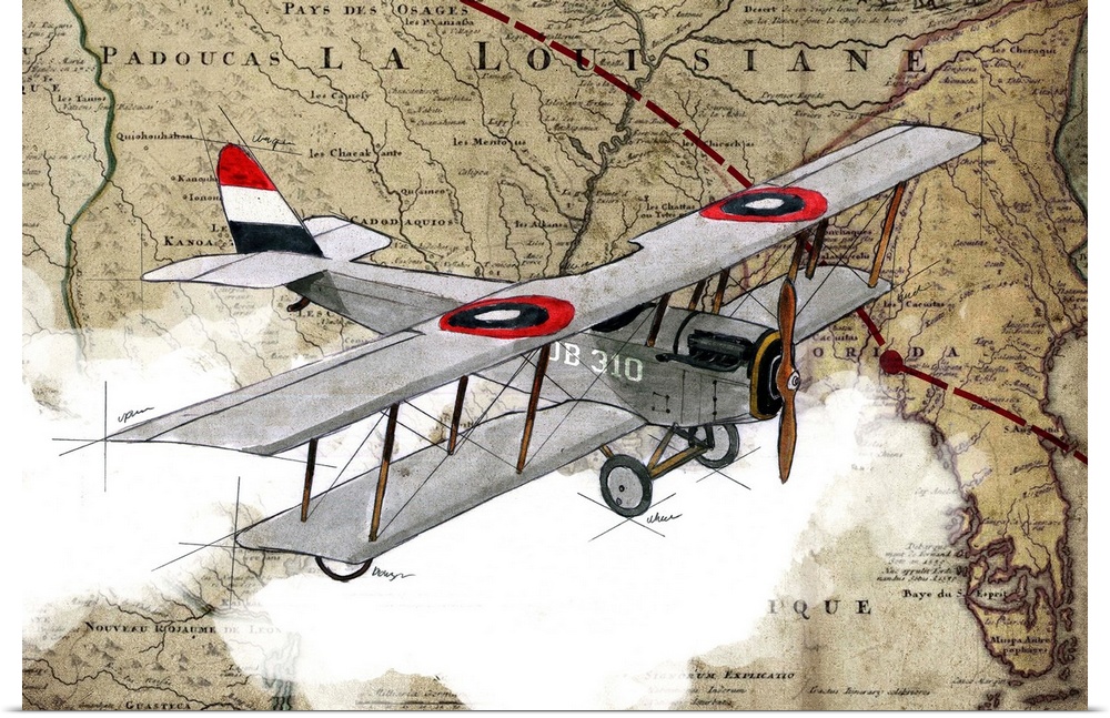 <p>Illustration of a gray biplane in flight with clouds and a map in the background.</p>
