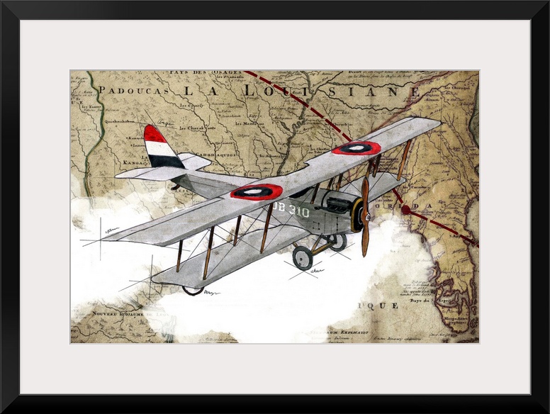 <p>Illustration of a gray biplane in flight with clouds and a map in the background.</p>