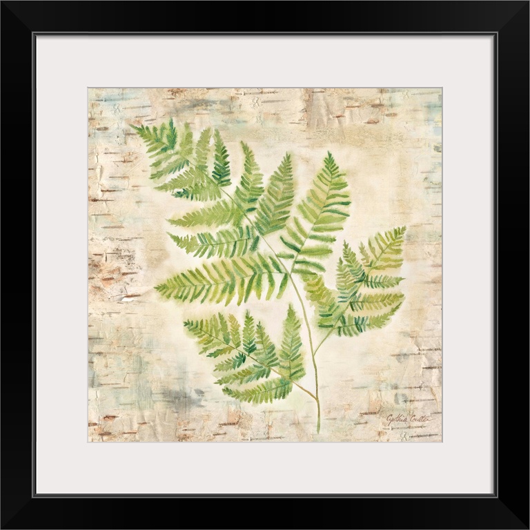 <p>Decorative artwork of a fern leaf against a wood bark texture with a brown border.</p>