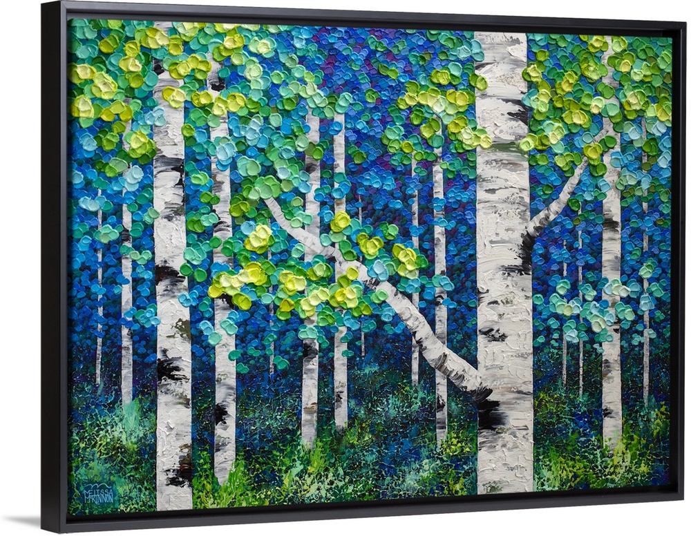 <p>Large original painting of green, blue, yellow aspen trees and birch trees in autumn forest by Canadian abstract landscape artist Melissa McKinnon created with a palette knife and thick texture</p>