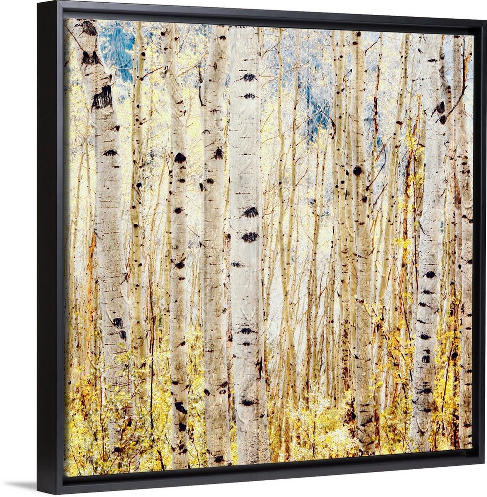 <p>Square photograph of a forest of birch trees with a textured overlay.</p>