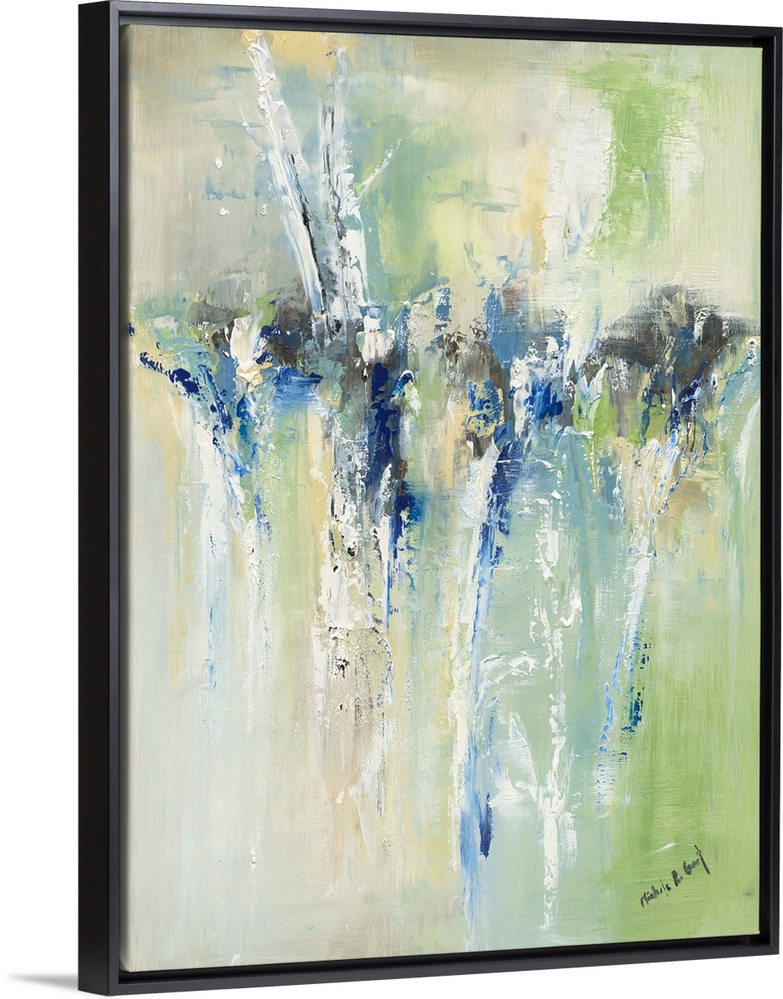<p>Large abstract painting in blue, green, yellow, gray, ad white hues.</p>