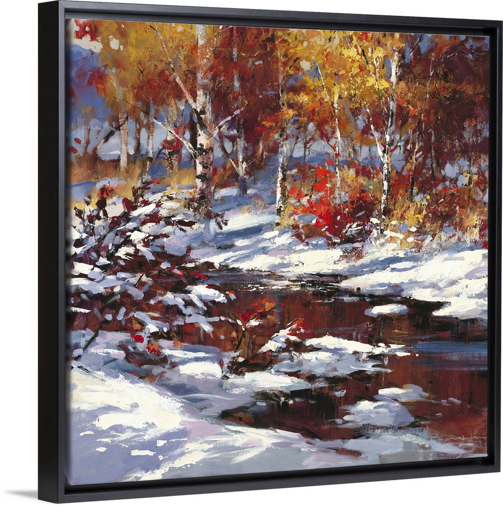 <p>Contemporary painting of a stream running through a forest in winter.</p>
