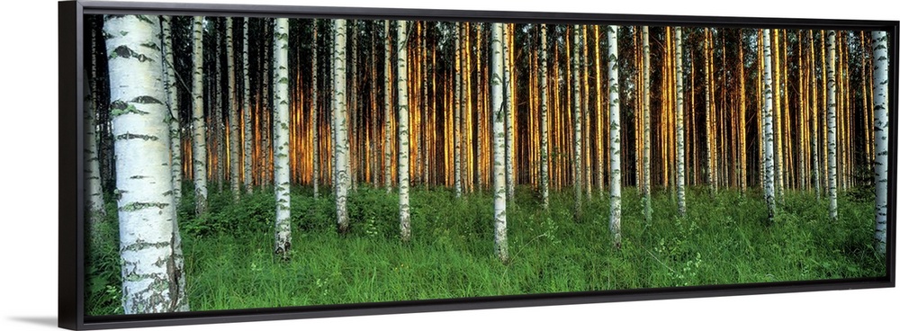 <p>Large panoramic photo of birch tree trunks in Saimma Lakelands, Finland. Top of trees are not visible.</p>