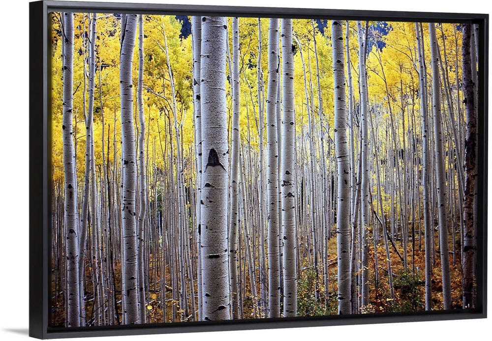 <p>A horizontal photograph of a thick forest of birch trees with yellow leaves.</p>