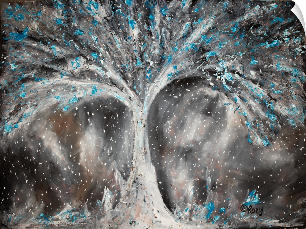 <p>Contemporary painting of a white tree with branches filled with blue birds.</p>