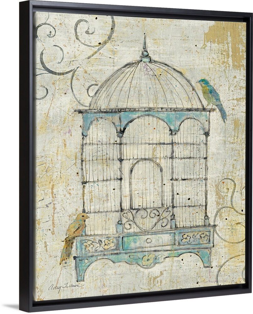 <p>Decorative artwork perfect for the home of an antique bird cage that has two birds sitting outside of it.</p>