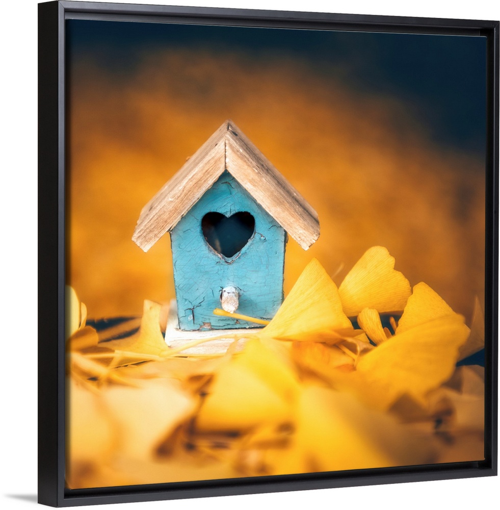 <p>Small wooden bird feeder surrounded by ginkgo leaves</p>