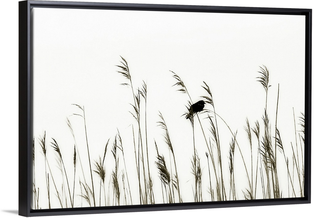 <p>This landscape photograph capture and tiny bird resting on thin bristles of sea grass contrasting with the blank sky behind them.</p>