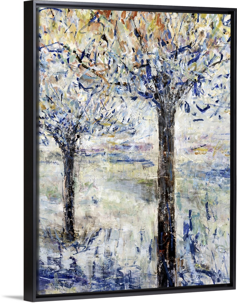 <p>Vertical contemporary painting of two trees in textured brush strokes.</p>