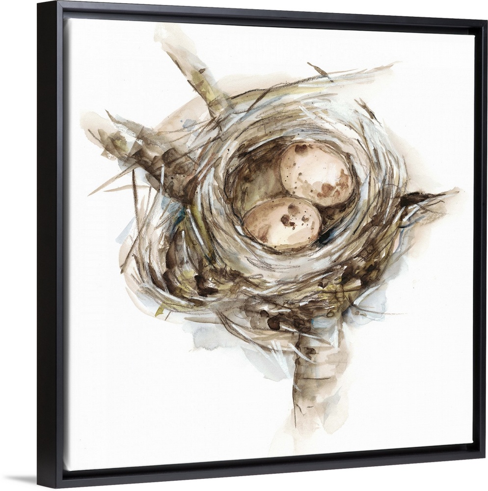<p>Watercolor painting of a bird's nest with two small pink eggs.</p>