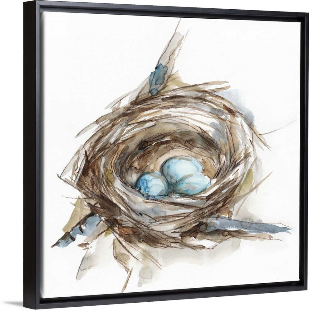 <p>Watercolor painting of a bird's nest with three small blue eggs.</p>