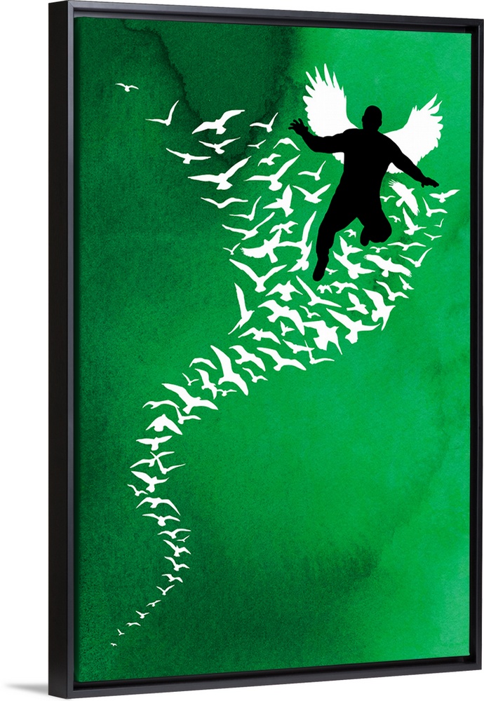 <p>Vertical painting of a flock of birds flying upwards with the silhouette of a man with wings in front of them.</p>
