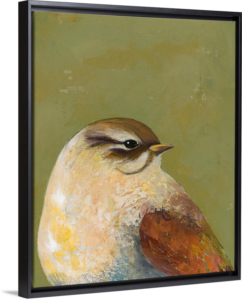 <p>Contemporary painting of a close-up of a garden bird against a green background.</p>