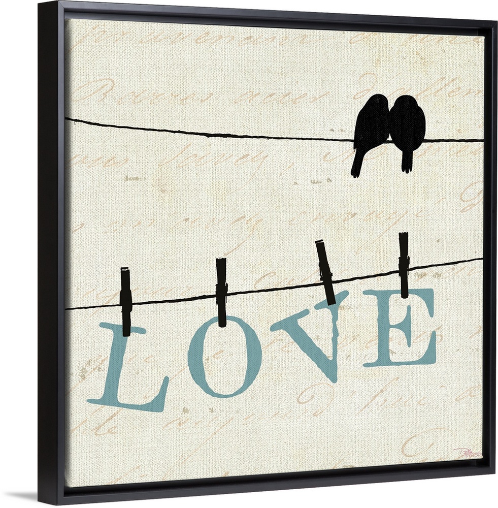 <p>Silhouette of two birds on a wire with another wire below them with letters pinned with clothespins that spell out love on a textured background with cursive script.</p>