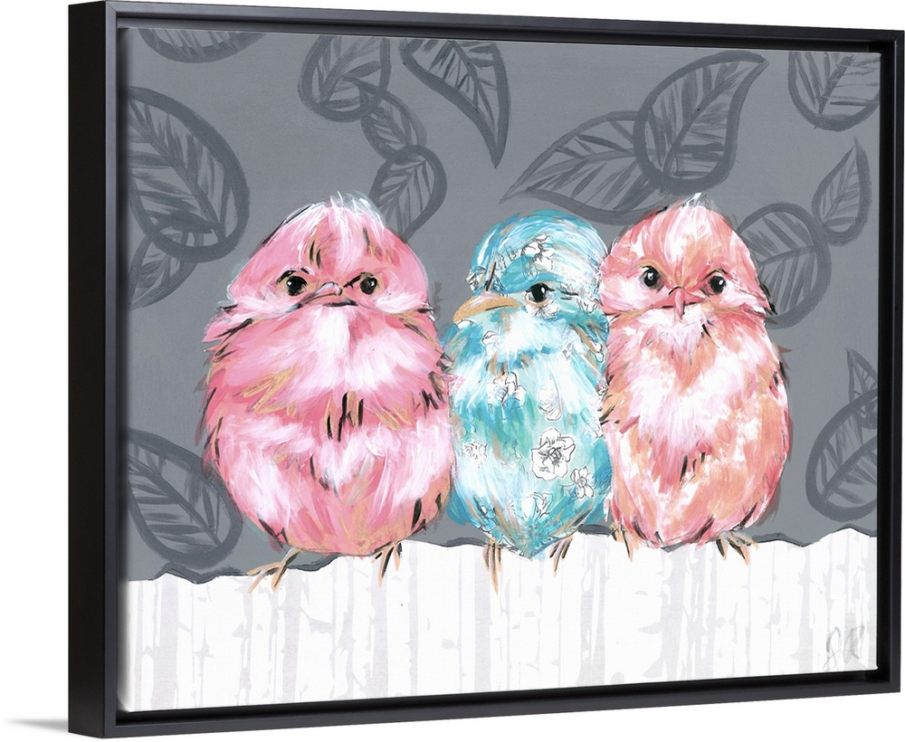 <p>Three bright colored birds in pink, peach and blue, perched on a white fence against a grey leaf patterned background.</p>