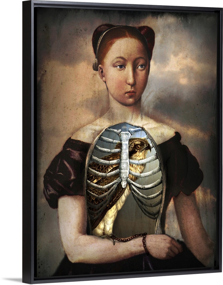 <p>A portrait of a young Victorian lady with the inside of her chest exposed, showing a hawk inside.</p>