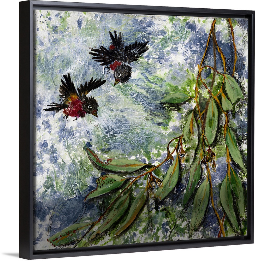 <p>Painting of two young birds that have just left the nest, keeping their eyes wide open, interested in the world.</p>