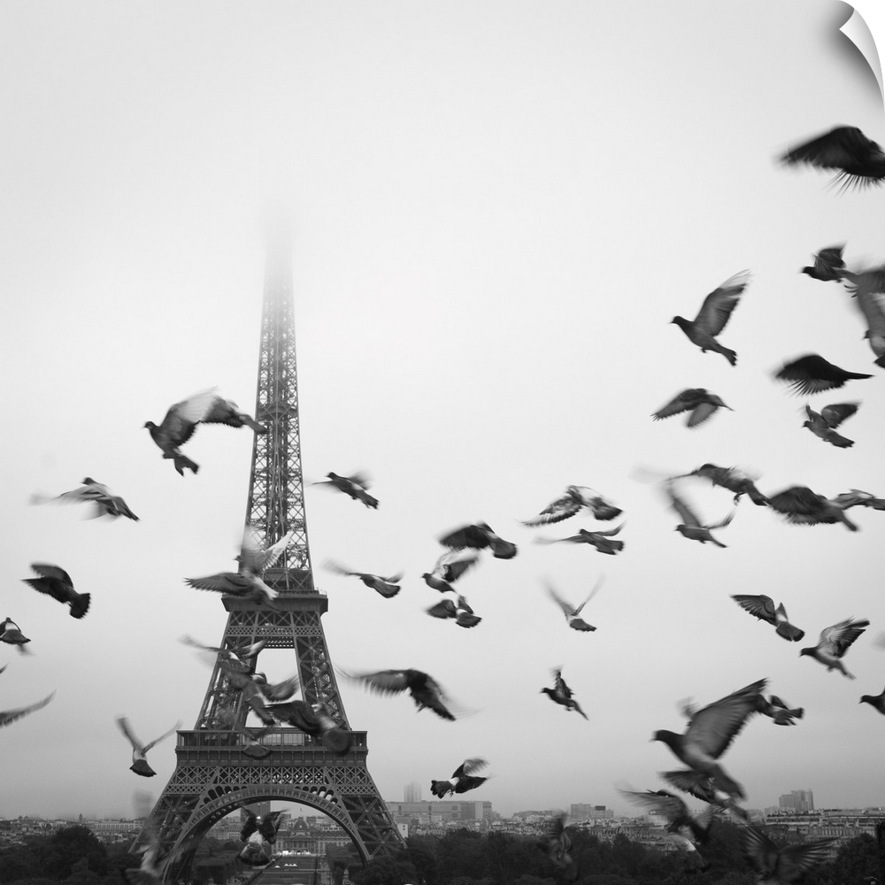 <p>Birds fly in front of the Eiffel Tower on a foggy, misty day in Paris, France</p>