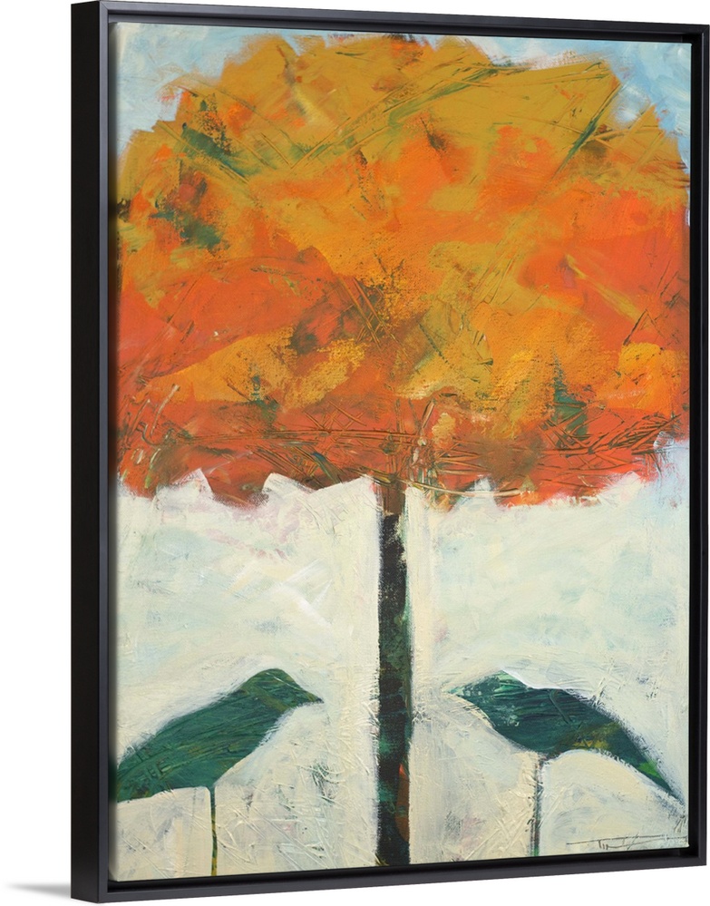 <p>Minimalist painting of two birds under a tree with autumn leaves.</p>