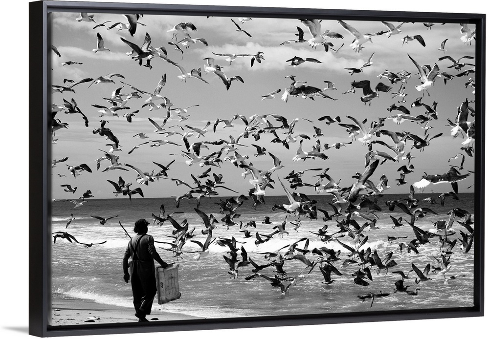 <p>A man on the beach with a large flock of sea gulls in the air.</p>