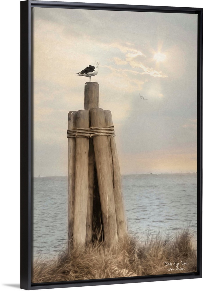 <p>A sea gull perched on wooden posts overlooking the ocean.</p>