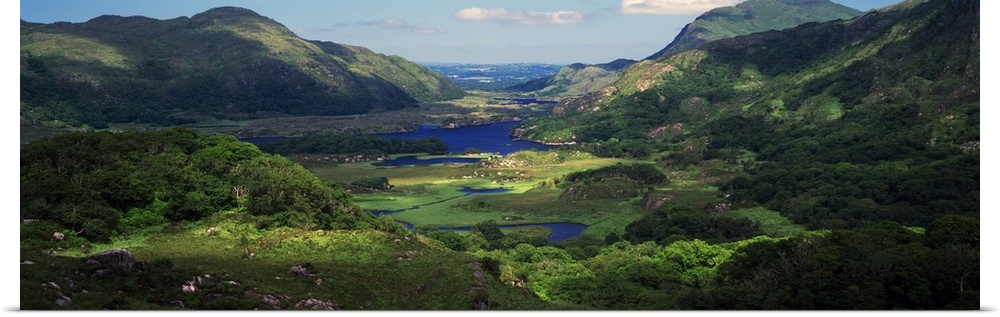 <p>View of an Irish valley with a stream running through the lush green landscape between the rolling hills.</p>