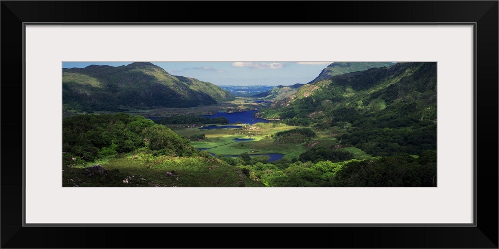 <p>View of an Irish valley with a stream running through the lush green landscape between the rolling hills.</p>