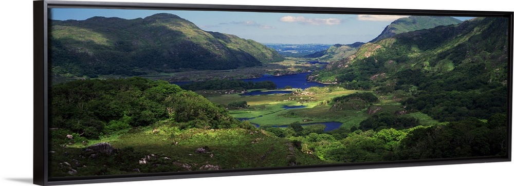 <p>View of an Irish valley with a stream running through the lush green landscape between the rolling hills.</p>