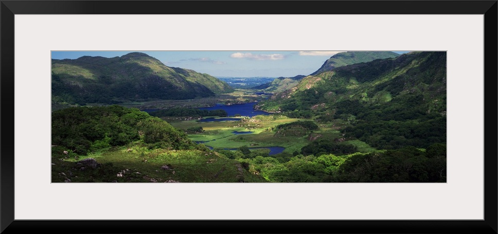 <p>View of an Irish valley with a stream running through the lush green landscape between the rolling hills.</p>