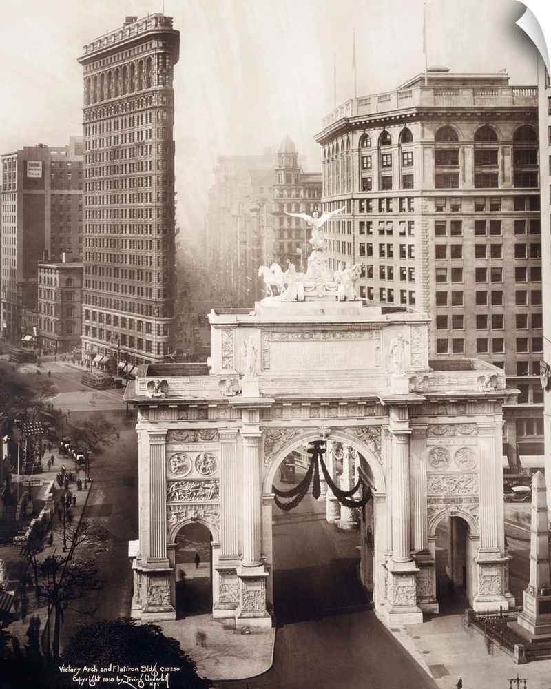 <p>Bird's eye view of Victory Arch and Flatiron building, New York City. Photograph by Irving Underhill, c1919.</p>