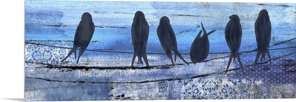 <p>Contemporary artwork of silhouetted birds on a line against a blue background.</p>